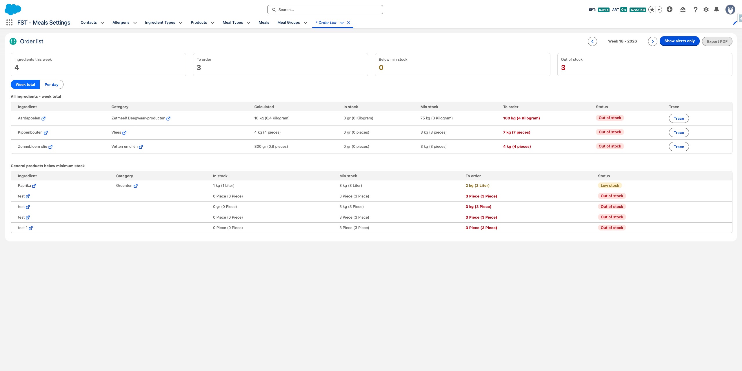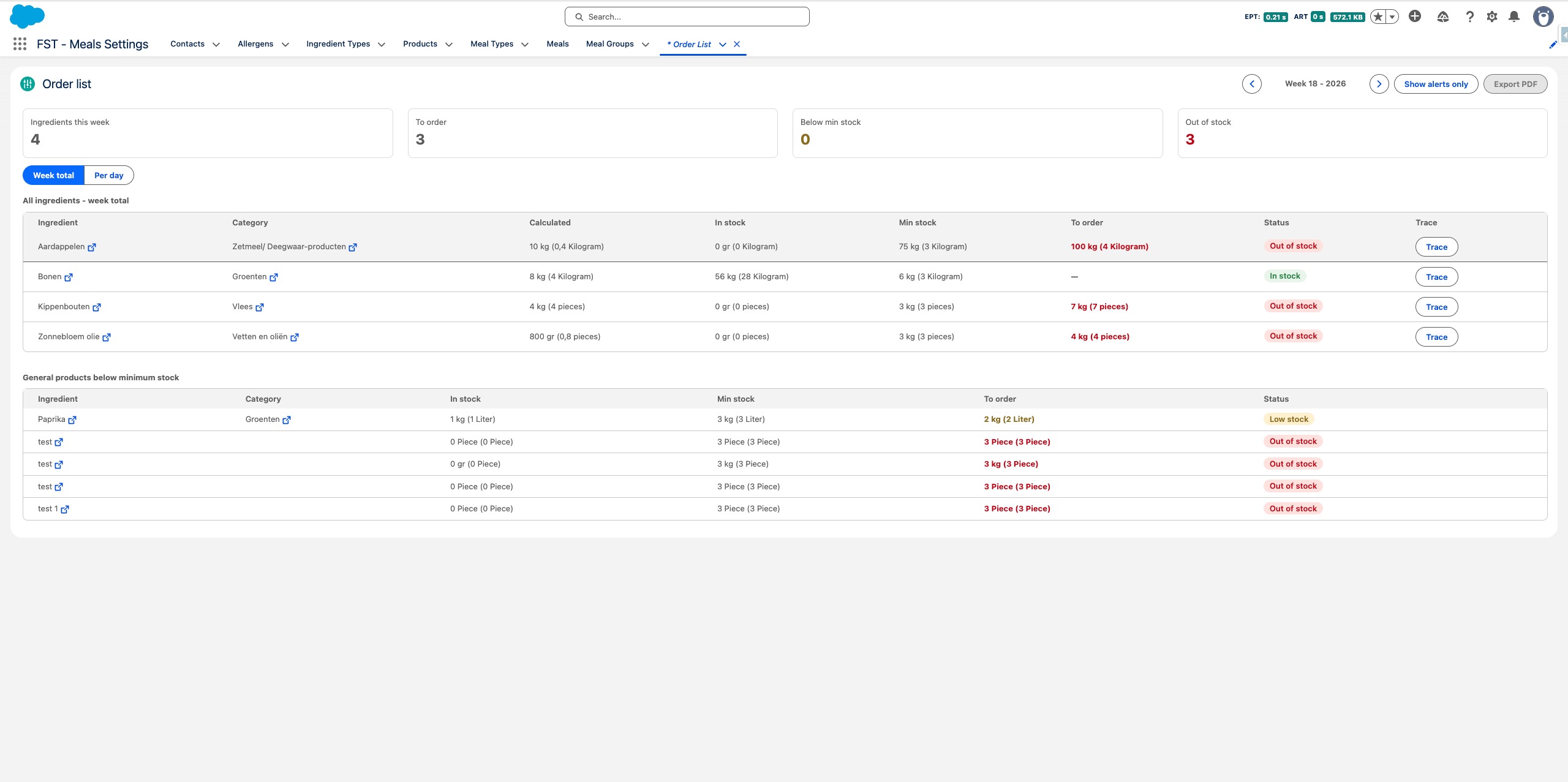 The Order list header gives you a quick summary of the week: total ingredients, items to order, products below minimum stock, and items out of stock.