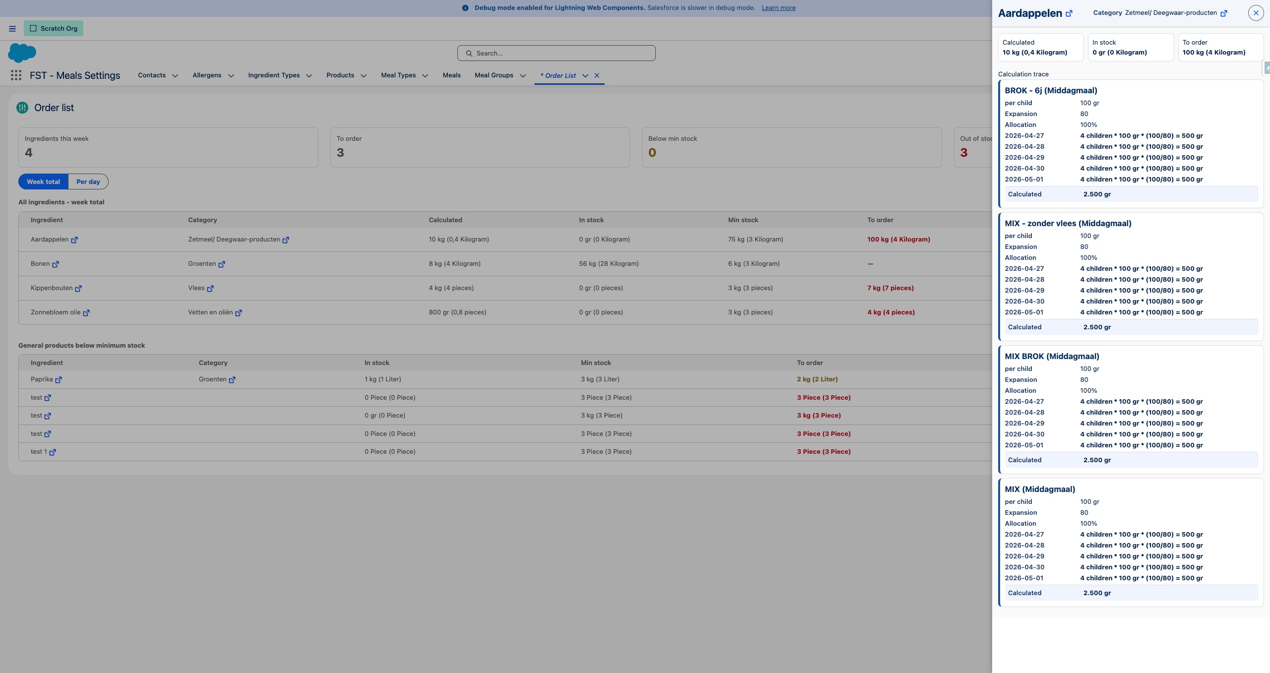 Click Trace on any product to open a detailed breakdown showing how the quantity was calculated — including per meal group, number of children, portion sizes, and daily allocations.